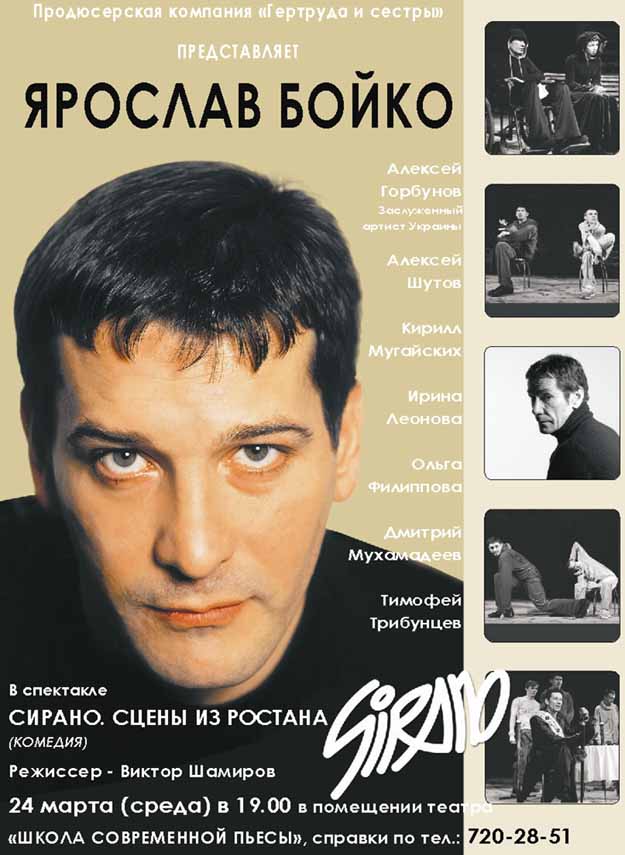 Еще одна приятная новость. 24 марта в 19-00 на сцене театра "Школа Современной пьесы" состоится премьера спектакля под названием "Сирано. Сцены из Ростана" с Ярославом в главной роли. Можно посмотреть электронную афишу. Заказать билеты можете на сайте Партер или по телефону в Москве 720 2851. Также при желании можно забронировать недорогие билеты (для этого сообщите мне на почтовый ящик свои имя и фамилию).